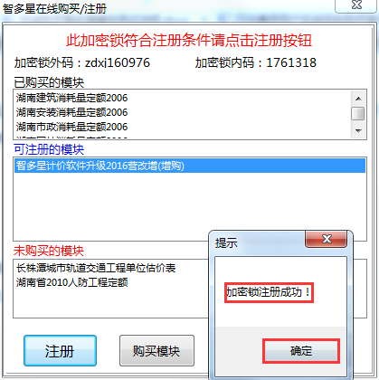 第六步:如需繼續(xù)購(gòu)買其他模塊,請(qǐng)點(diǎn)擊‘購(gòu)買模塊’按鈕;如無需購(gòu)買,關(guān)閉對(duì)話框即可,此時(shí)您的加密鎖已成功完成2016營(yíng)改增升級(jí)。